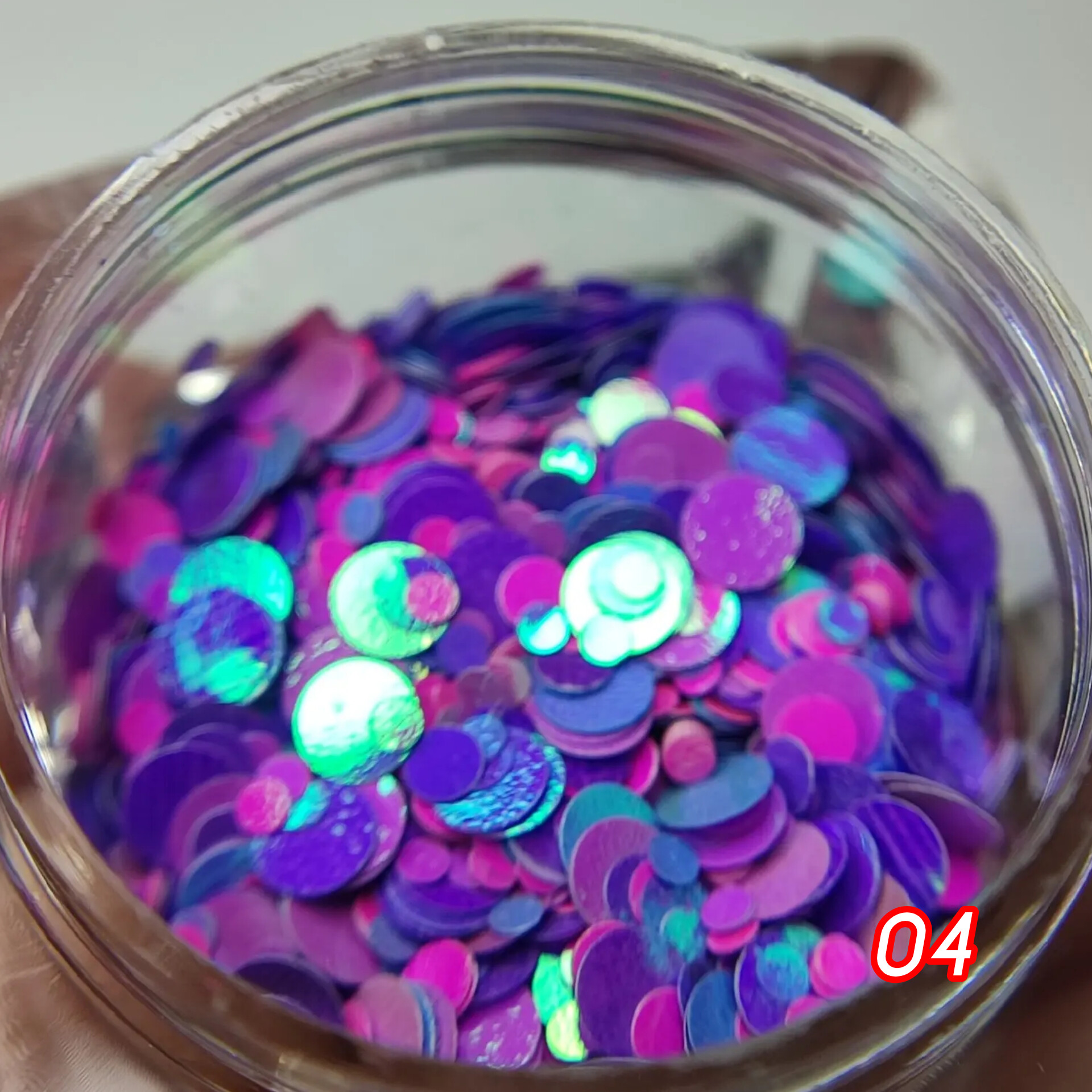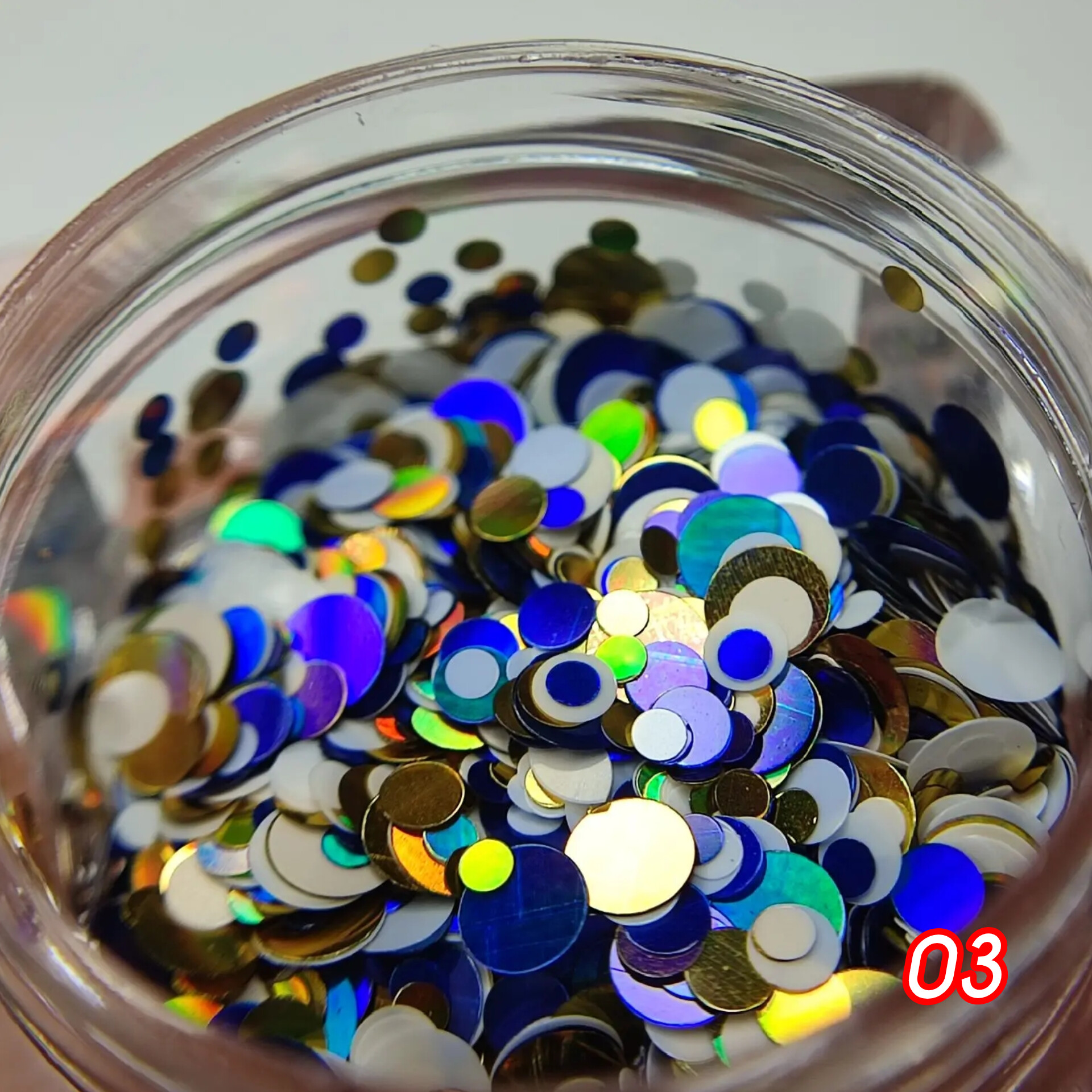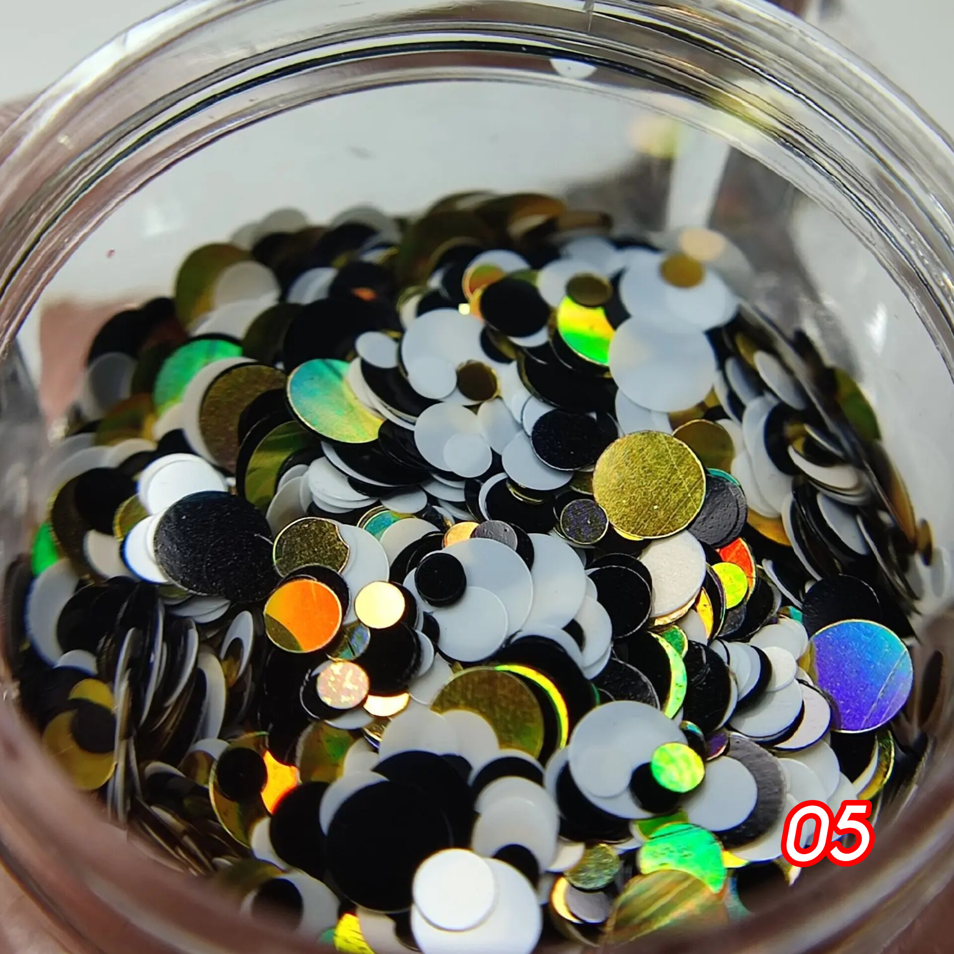 Дизайн для ногтей в виде разноразмерных блестящих кружков. Хорошо ложатся на непросушенное покрытие, поддается опиливанию. Может использоваться в различных дизайнах ногтей, легко смешивается с базами и гелями, а также в качестве дополнения к основному дизайну.